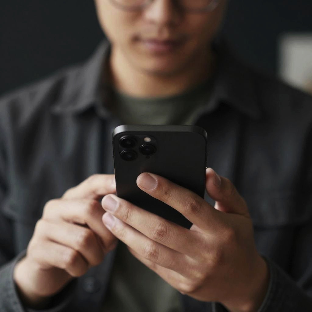 A close-up photograph of a person's hands holding a black smartphone, with the person's face and upper body blurred in the background. The person is wearing a dark jacket over a green shirt, and their fingers are focused on the phone's screen. The background is dark and out of focus, suggesting an indoor setting. The image has a shallow depth of field, emphasizing the phone and hands.