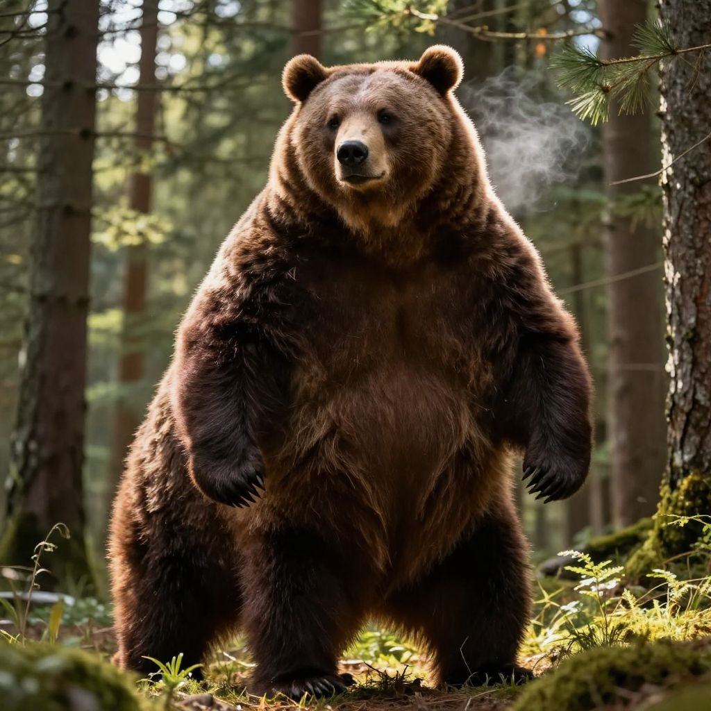 Furry abs of a large anthropomorphic bear, thick brown fur soft yet muscular, sunlight streaming through dense pine forest, powerful posture with subtle breath vapor, hyperrealistic textures capturing both fat and muscle in natural balance.