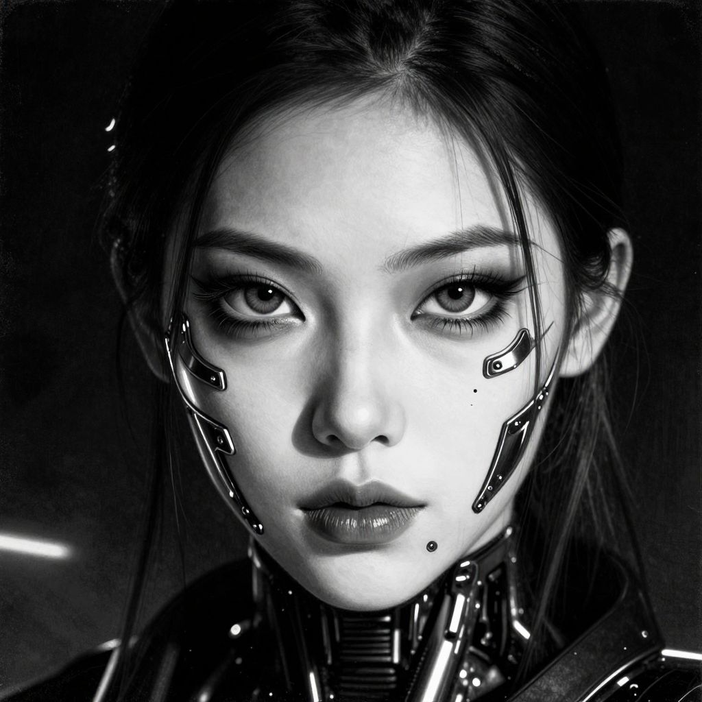 This is a highly detailed, black-and-white digital portrait of an East Asian woman with a futuristic, cyberpunk aesthetic. Her face is centered in the frame, with intense, wide-open eyes that have a metallic, reflective quality. Her straight, dark hair is parted in the middle and falls slightly over her shoulders. Her skin is smooth, with intricate, metallic patterns and lines on her cheeks, resembling cybernetic enhancements. She wears a high-collared, glossy black outfit that appears to be made of latex or similar material. The background is dark and indistinct, making her illuminated face and cybernetic features the focal point. The image has a high-contrast, grainy texture, enhancing the futuristic and dystopian feel.