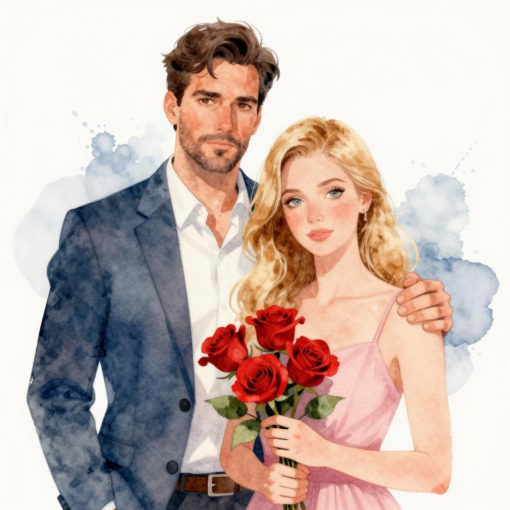 Watercolor illustration of a man and woman. Man with dark hair, blue jacket, white shirt, serious expression, standing behind woman. Woman with long blonde hair, pink dress, holding red roses, soft expression. Background with watercolor splashes. Man's hand on woman's shoulder. Woman in foreground, man in background.