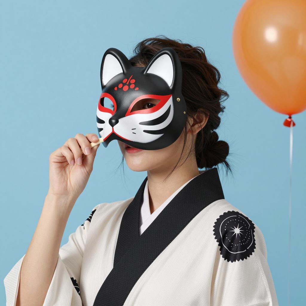 Person wearing white fox mask with blue markings and purple tassels, purple floral accessory, white and blue kimono-style clothing, brown hair tied back, neutral background. Upper body shot, face covered by mask, no visible facial expression.