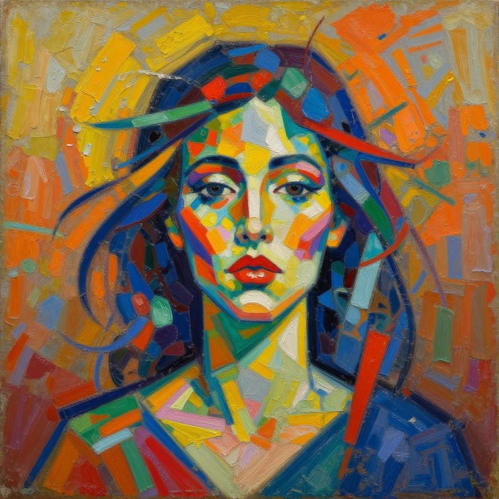 Vibrant, abstract oil painting of a woman with multicolored, geometric facial features and flowing hair against an orange and yellow background.