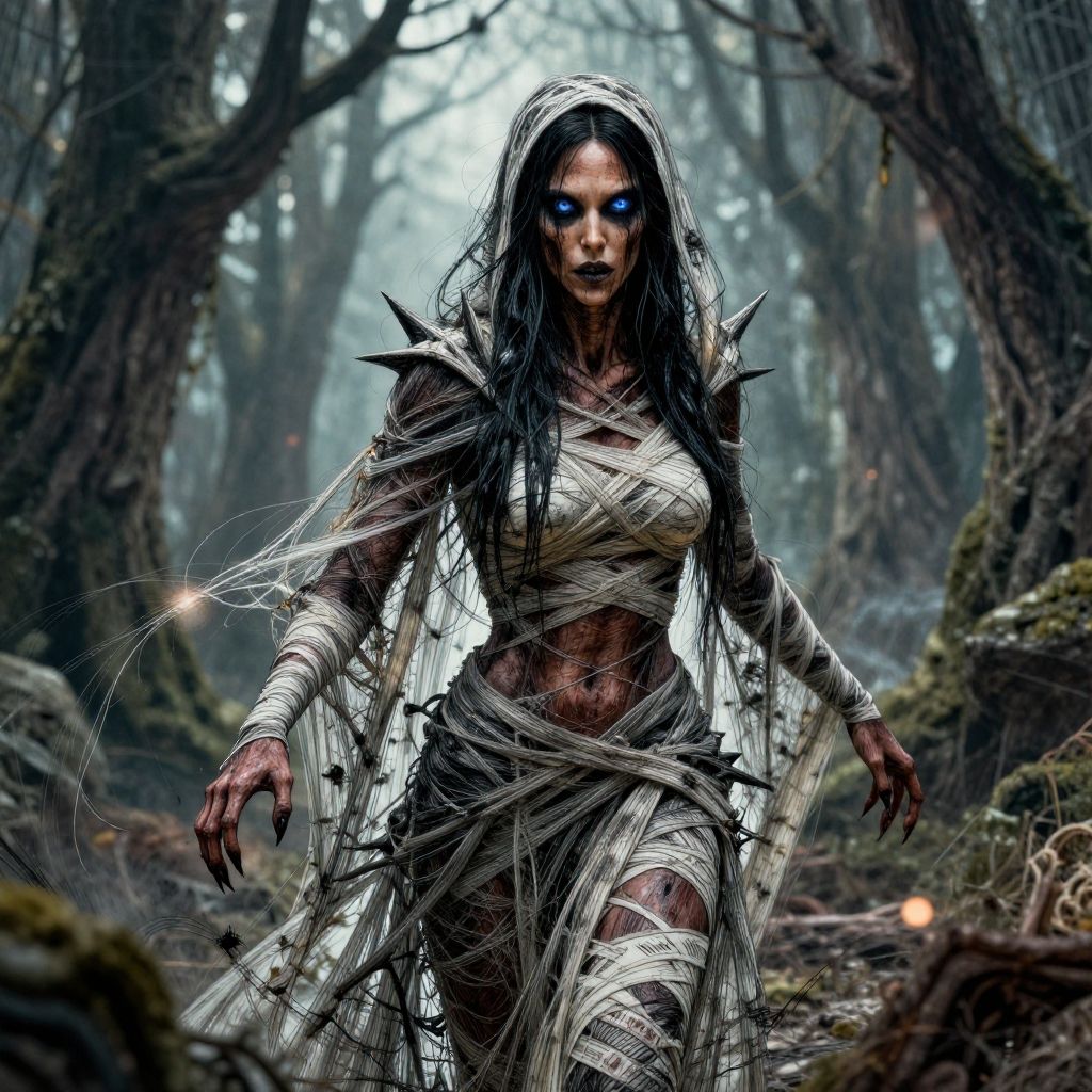 Digital artwork of a fierce, dark-haired woman with glowing blue eyes, wrapped in tattered white bandages, standing in a misty, forested