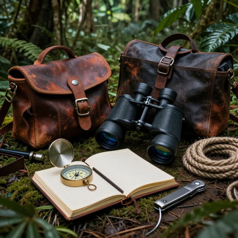 Paraphernalia related to an explorer's journey, including compass, binoculars, travel journals, weathered leather bags, rope coils, and a pocket knife, set against a background of dense jungle foliage, moody and adventurous, ultra-detailed