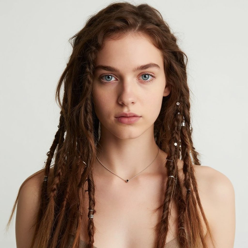 Photograph of a young Caucasian woman with fair skin and blue eyes, centered against a plain white background. She has long, dark brown dreadlocks adorned with small white beads and silver hairpins. Her expression is neutral, with slightly parted lips. She wears a delicate gold necklace with a small pendant. The image is sharply focused, highlighting the texture of her hair and the smoothness of her skin. She is not wearing a shirt, revealing her bare shoulders. The overall style is minimalist and natural.