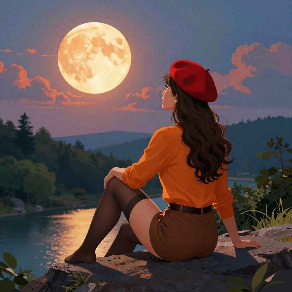 A digital art piece features a confident woman with long, wavy brown hair, wearing a red beret, orange long-sleeve shirt, and brown shorts with thigh-high stockings. She's sitting on a rocky cliff, gazing at a vibrant, orange full moon in a sky filled with colorful clouds. The background includes a lush, green forest and a serene lake, adding depth and contrast to the scene.
