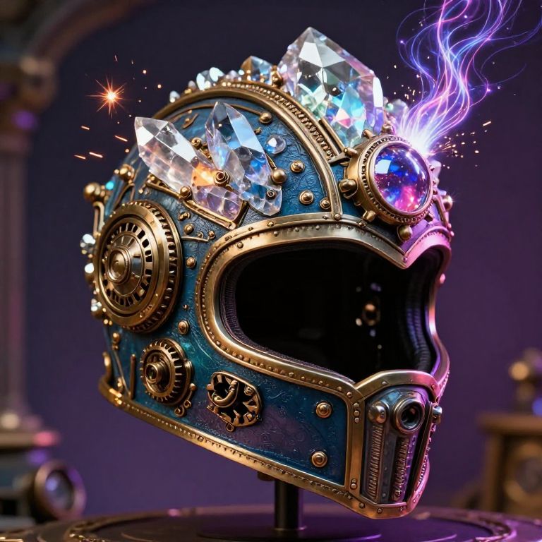 Make your own helmet concept, vibrant fantasy setting where a hero forges a magical helmet from crystal and enchanted metals, sparks flying and ethereal light beams, highly detailed craftsmanship, dramatic shadows and rich color palette, steampunk elements included.