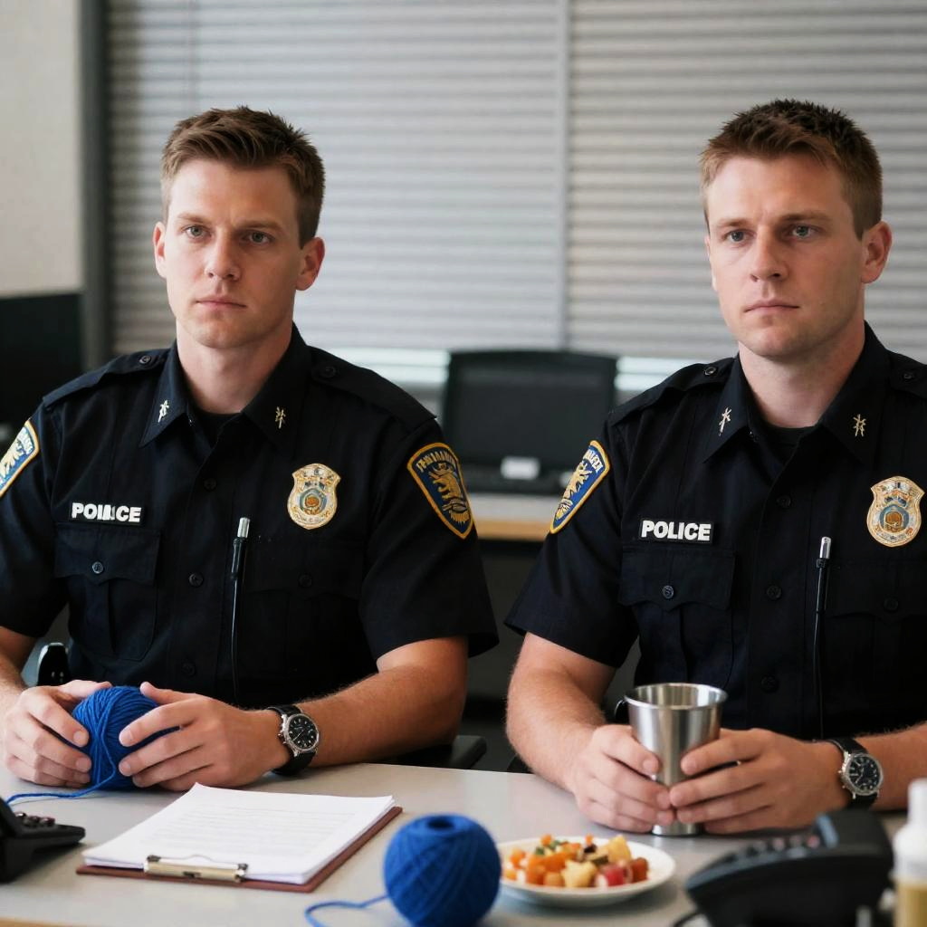 Photograph of two male police officers in black uniforms with blue and gold patches, sitting at a table. Both have short brown hair, serious expressions. One officer holds a ball of yarn, the other a stainless steel cup. Background includes closed blinds and blurred office setting. Desk in foreground with documents, phone, and food. One officer's name patch reads "Sergeant."