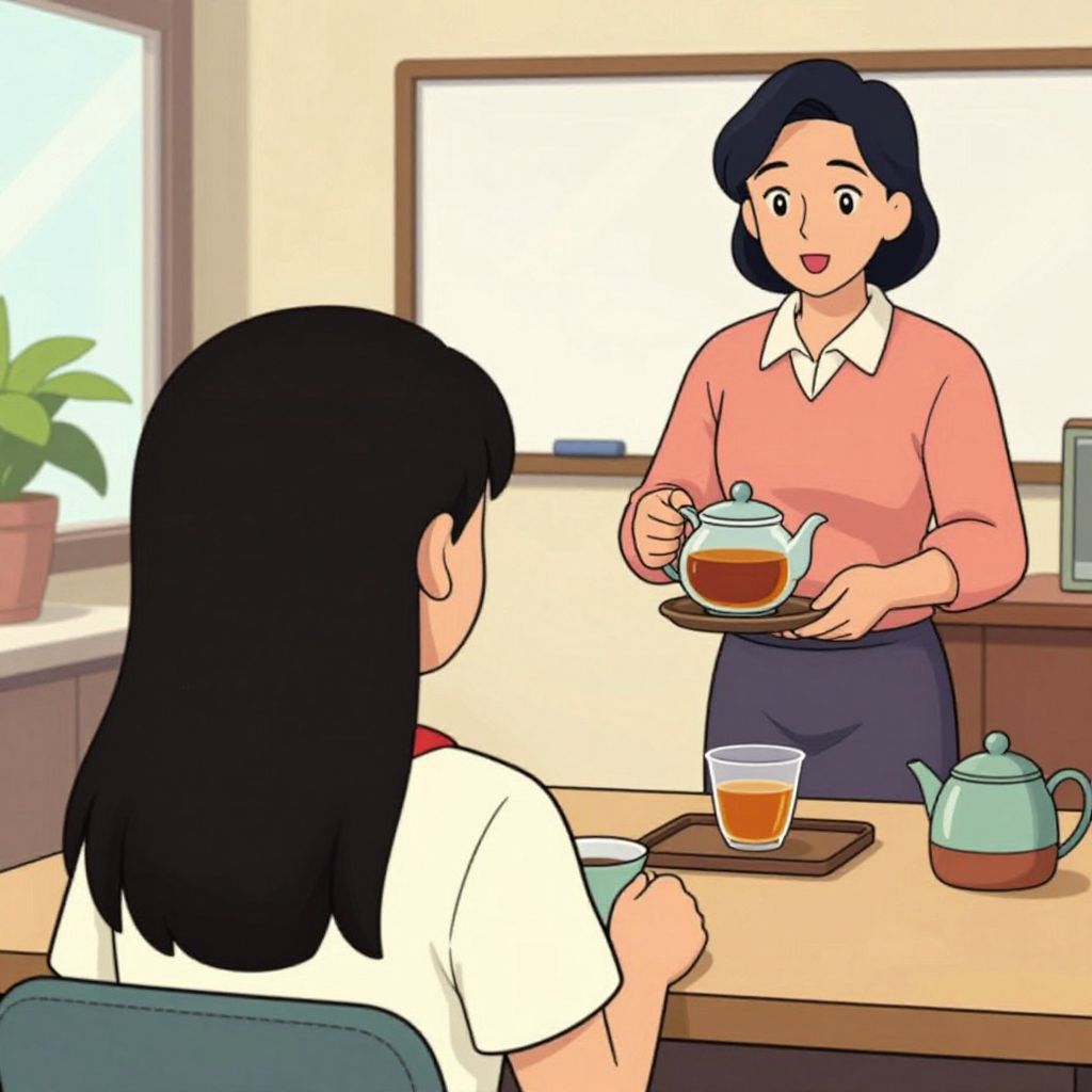 This digital illustration depicts a bright, sunlit café scene. A woman with black hair and a pink long-sleeve shirt, standing behind a wooden counter, holds a teapot and tray with a teacup of orange-brown tea. She has a friendly, smiling expression. Facing her, a woman with black hair, seated and wearing a white shirt, looks at the tea. On the counter are a green tea kettle and a glass of tea. A window with a potted plant is visible in the background, and the walls are cream-colored. The style is colorful and cartoon-like.