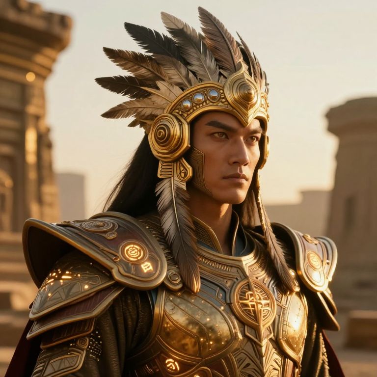 Photorealistic digital artwork of a young man with tan skin and straight black hair, wearing elaborate, golden Native American-inspired armor adorned with intricate patterns and feathers. He has a stern expression and is looking to the right. His helmet features a large, ornate headpiece with black and white feathers. The background is softly lit with blurred, ancient stone structures, suggesting a historical or mythological setting. The sunlight highlights the metallic textures of his armor, casting warm, golden hues across the image. The overall style blends realism with a slightly fantastical, epic feel.