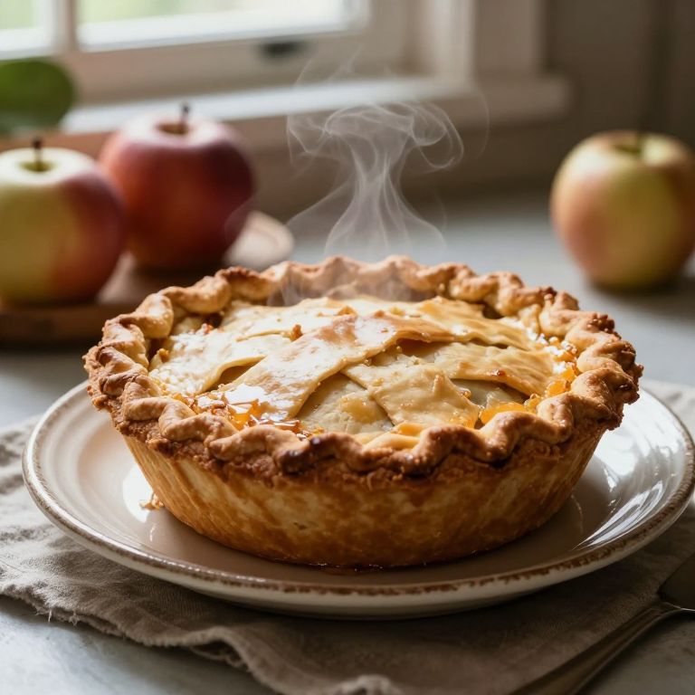 Apple pie on a vintage ceramic plate, steam gently rising, cozy home kitchen setting with soft natural light, detailed pastry crust texture, rustic and inviting atmosphere, warm color palette with rich highlights.