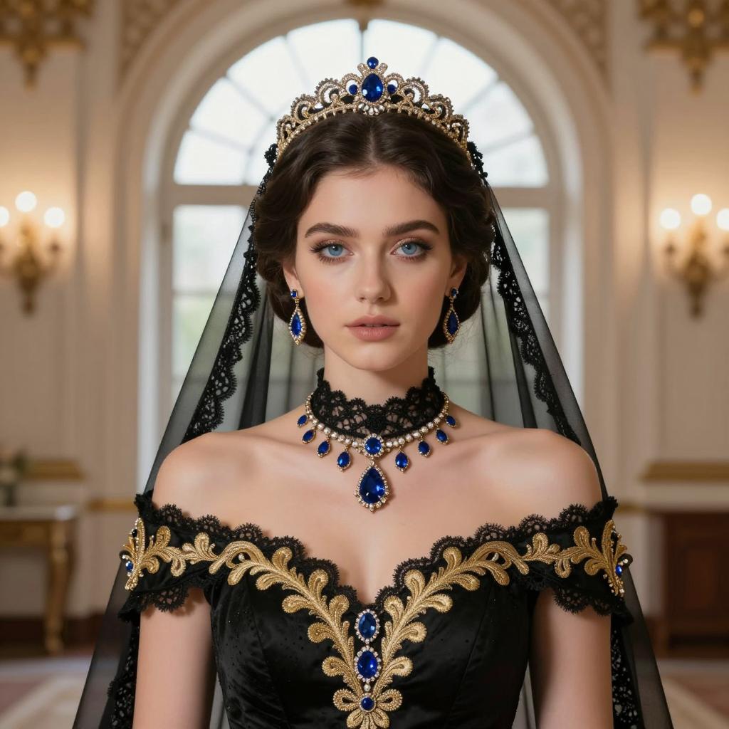 A portrait of an elegant young woman dressed in a black off-shoulder gown with intricate gold embroidery. She is wearing a matching black lace choker, blue gemstone necklace, earrings, and hair accessories. Her black veil with lace trim complements her styled black hair, and she has striking blue eyes and soft makeup. The background shows a softly lit, ornate interior with arched windows and sconces, suggesting a ceremonial or formal setting.