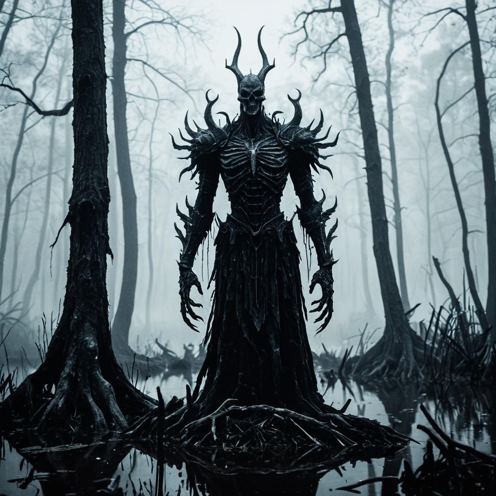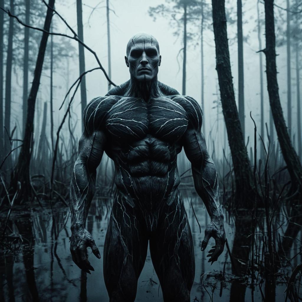 Nightmarish depiction of a glowing white alien specter, with black limbs, veins popping out, and a godly, pure white body. Set in a foggy dark forest, the hyperrealistic scene exudes sinister and eerie tones.