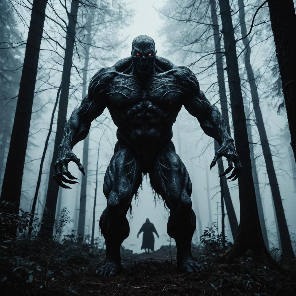 A hyperrealistic image of a nightmarish alien specter with glowing white skin, black limbs, and prominent veins. The creature stands in a foggy, dense dark forest with tall trees and ferns, creating a sinister and eerie atmosphere. The alien has red glowing eyes and a skeletal, muscular body structure.