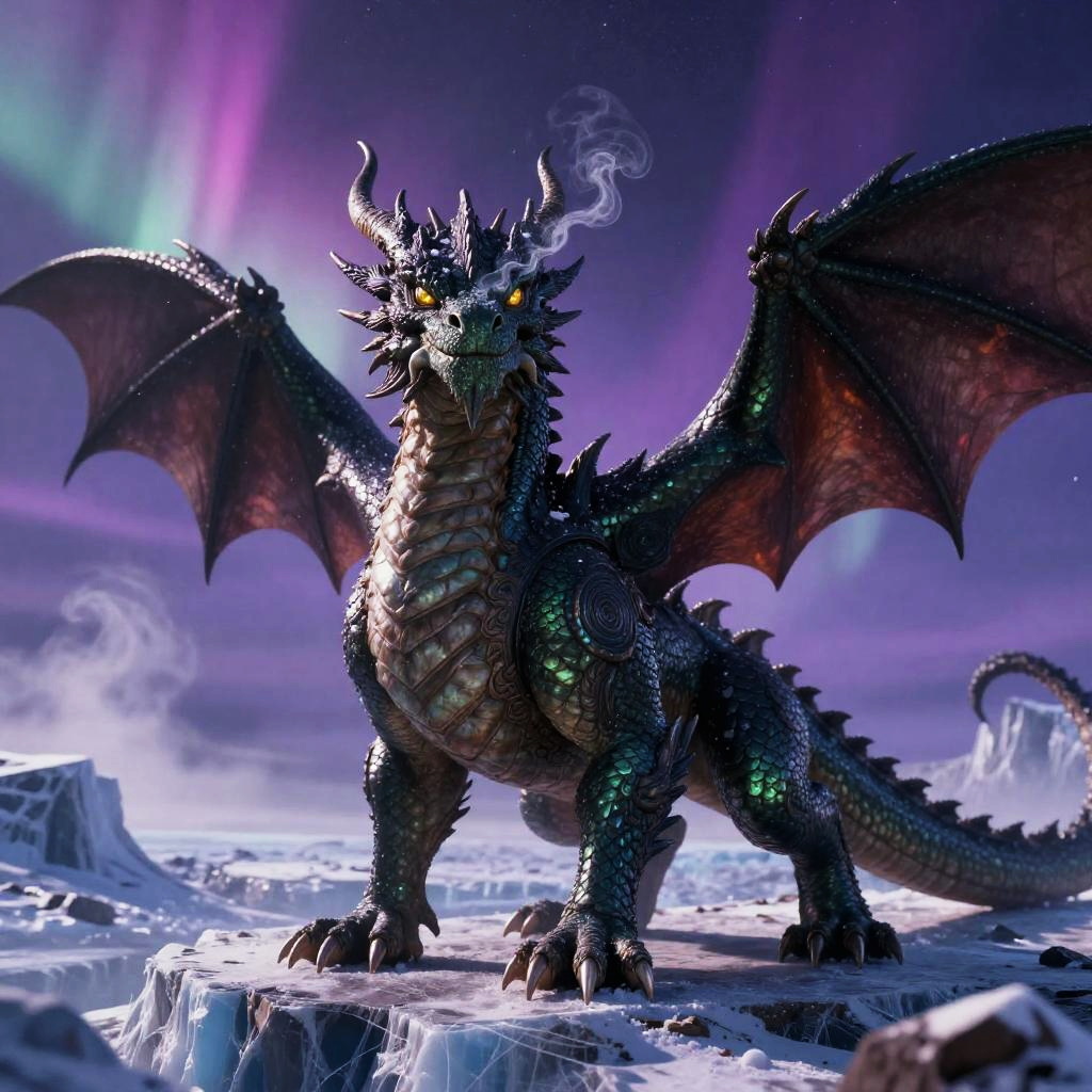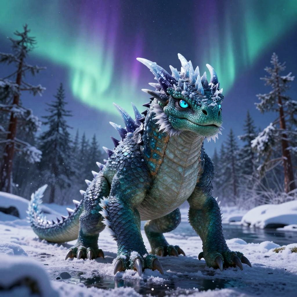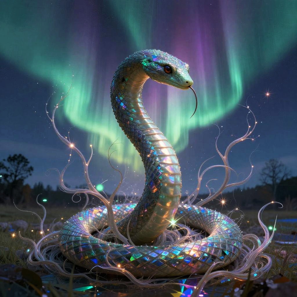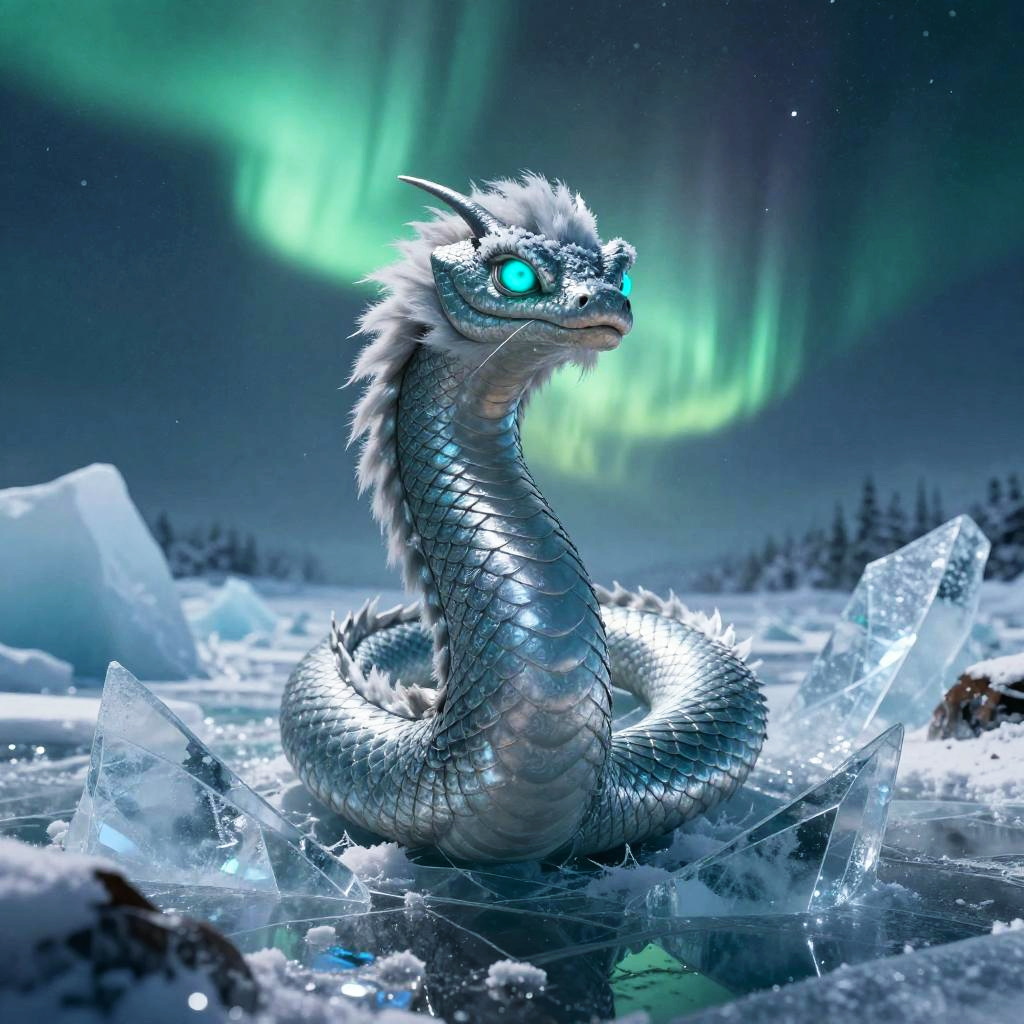 Photorealistic digital art: shimmering blue-scaled snake with glowing eyes in snowy, icy landscape, under vibrant green and blue aurora borealis