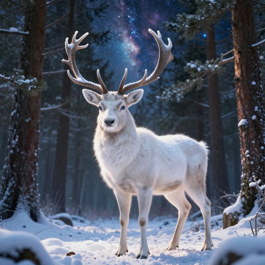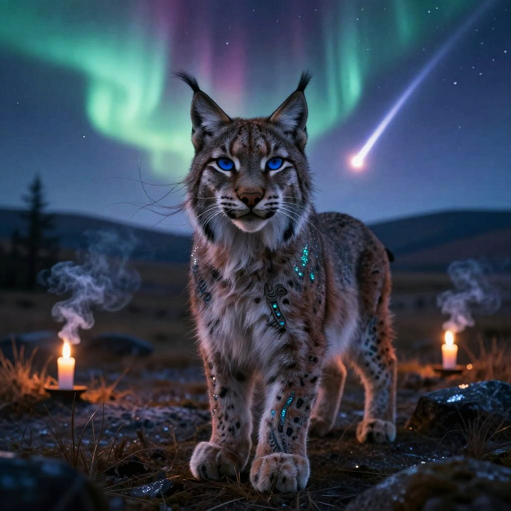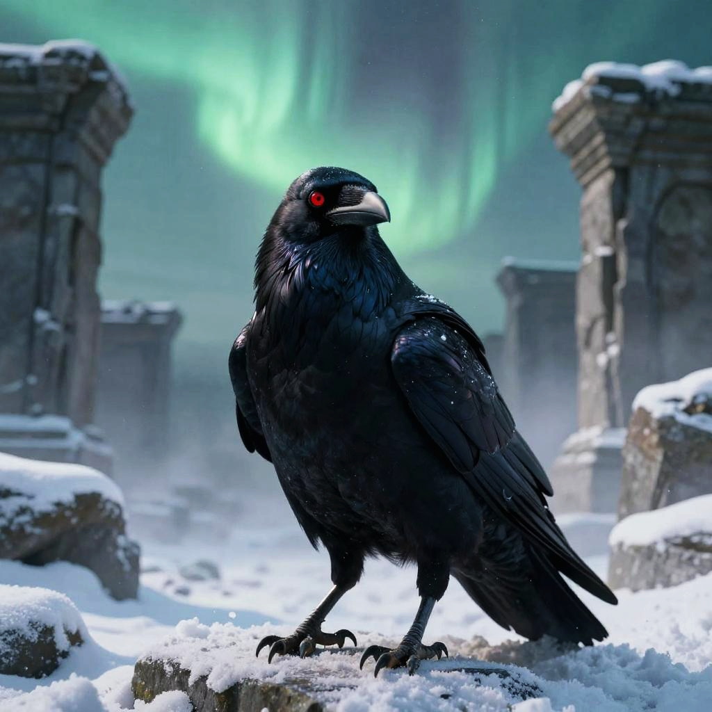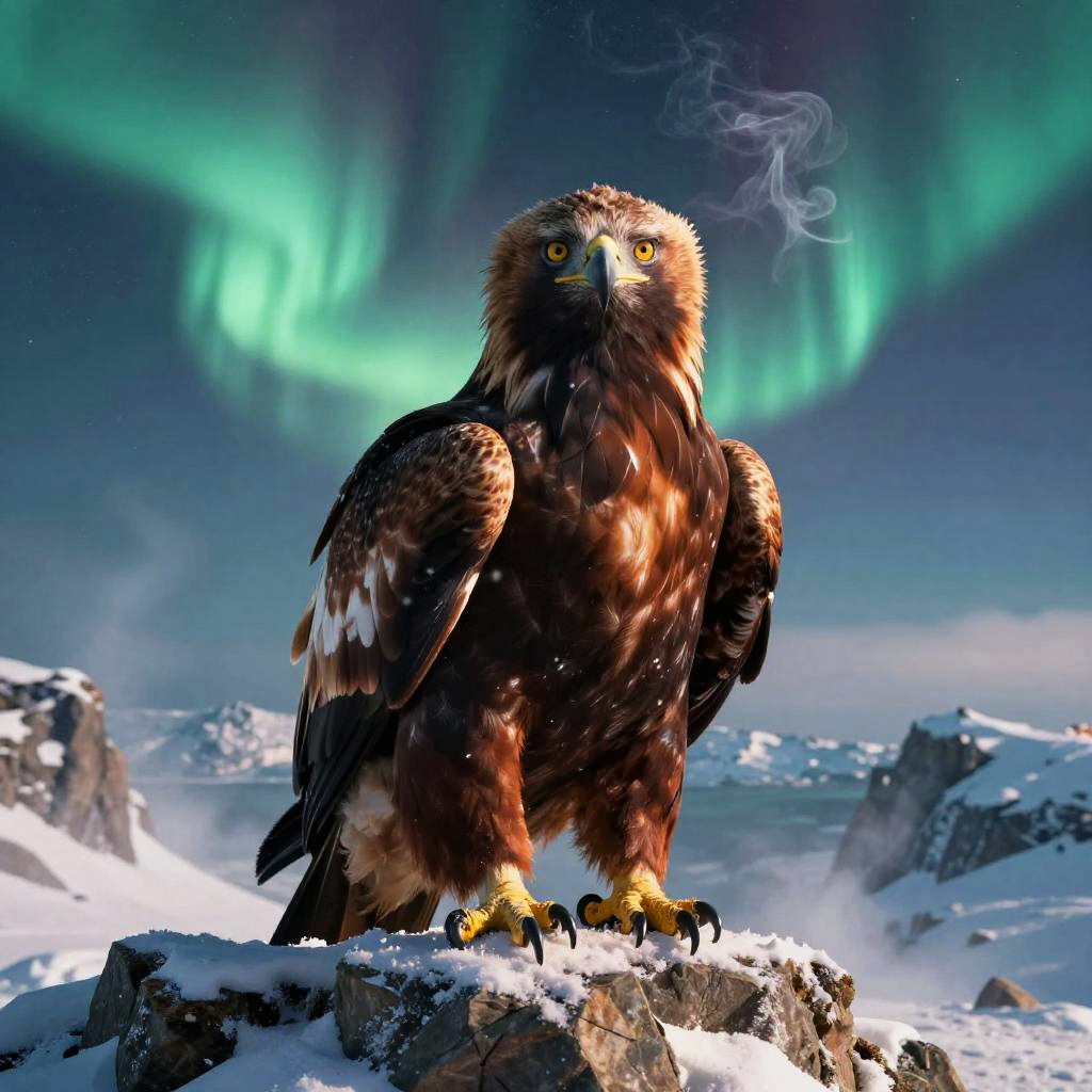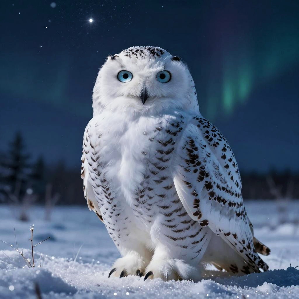 Photorealistic digital art: shimmering blue-scaled snake with glowing eyes in snowy, icy landscape, under vibrant green and blue aurora borealis