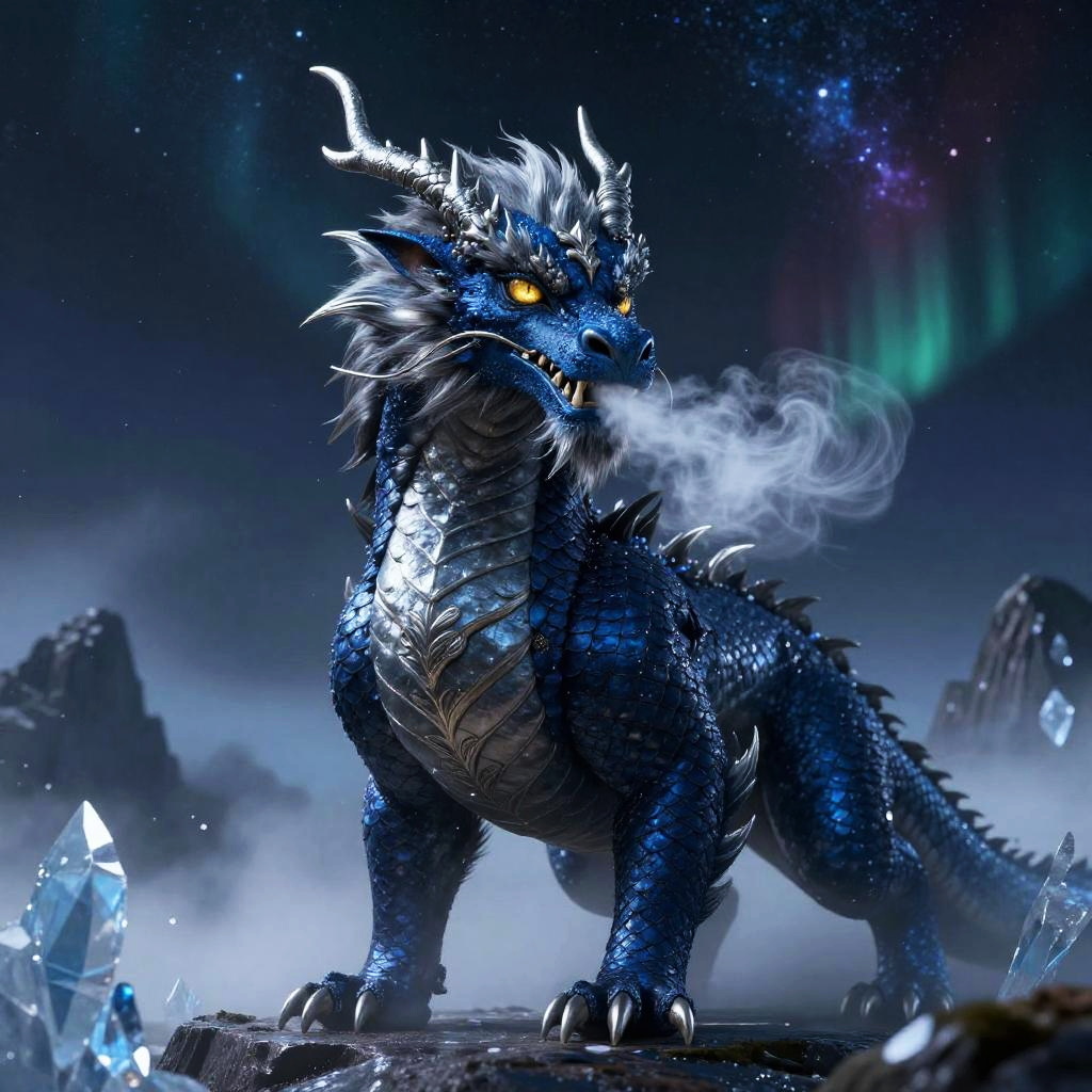 Portrait, low-angle, looking at viewer, detailed fluffy fur, dynamic composition, cinematic depth of field; intense azure serpent dragon with crystal blue eyes and intricately patterned iridescent scales, curled in dynamic half-body pose framed at frostbitten lake shore shattered by ice flows and spindly dead trees beneath a vibrant swirling aurora australis; moody color grading, rim light, half-body shadow, ambient light on the body, particle snow, stars and nebula, reflective highlights; ultra realistic, high detail, ray traced reflections, octane render, cinematic color grading, blender cycles, 8k, soft bloom, volumetric light, intricate textures, physically based shading, subtle bloom, coherent anatomy
