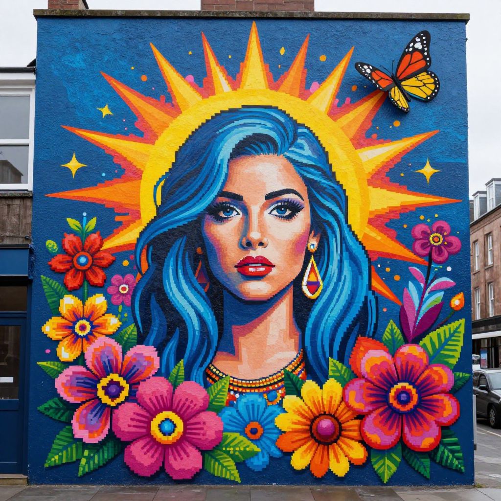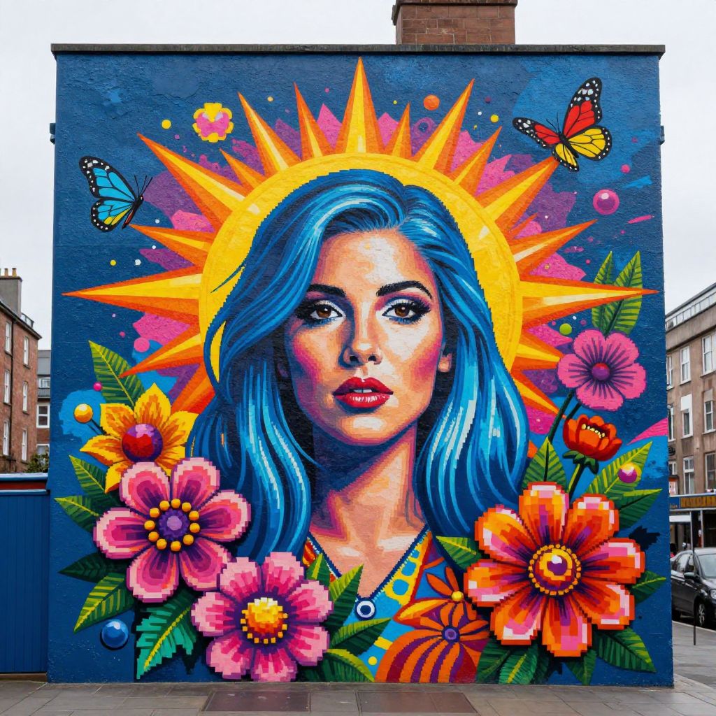 A vibrant mural in Glasgow showcases a striking digital art piece featuring a woman with blue hair and a radiant sunburst halo, surrounded by a kaleidoscope of colorful flowers and butterflies, blending pop art and street art aesthetics with bold, high-definition pixelated textures.