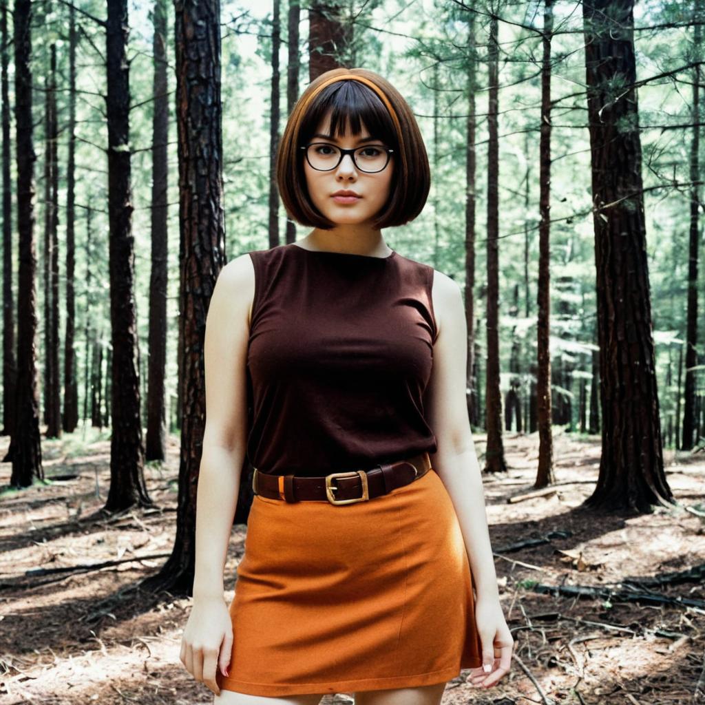 Velma action outfit ,1girl, multicolored clothes, glasses, tree, short hair, solo, dress, multicolored dress, outdoors, realistic, brown hair, nature, lips, standing, forest