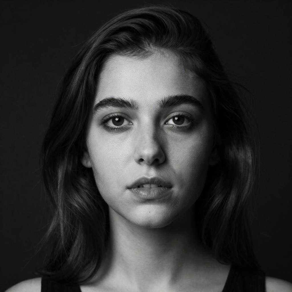 Black and white photograph of a young woman with shoulder-length, slightly wavy hair. She has a neutral expression, slightly parted lips, and direct eye contact with the camera. Dark background. High contrast, focused on her face.