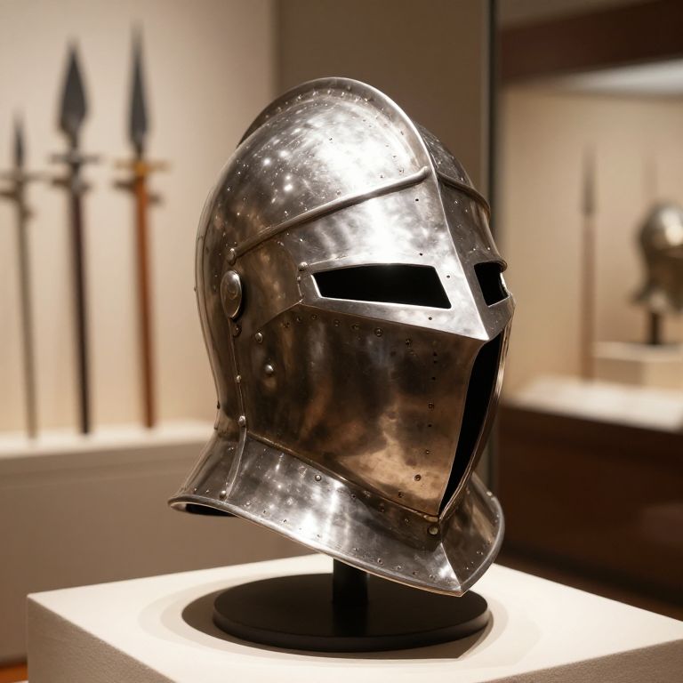 Crusader knight helmet displayed in a museum exhibit, surrounded by medieval weapons and artifacts, clean and polished with intricate designs, soft gallery lighting highlighting every curve, photorealistic style with attention to material and reflections.
