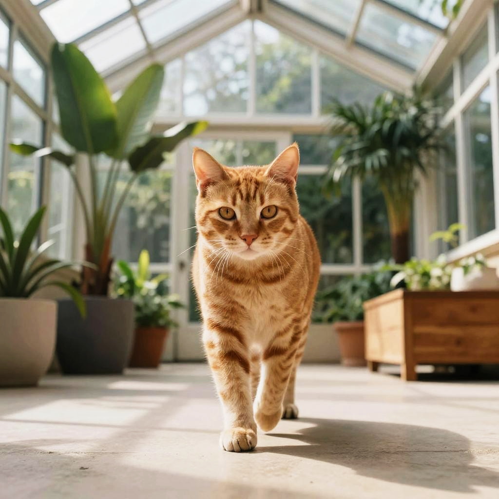 Athletic sleek ginger tabby with sharp amber eyes confidently walking toward the viewer across sunny modern glass conservatory with tall tropical plants, lit by bright midday indirect sunlight through glass ceiling. Natural textures of fur, fabric, and wood emphasized; inviting and homey atmosphere; shallow depth of field; crisp whiskers; soft vignetting; balanced composition; subtle film grain; realistic color rendering; gentle contrast; fine detail throughout.