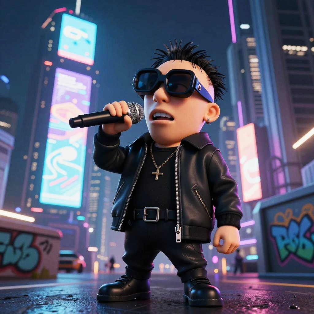 Futuristic Midget Rapper in Cityscape