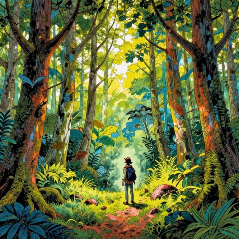 Inking style of arthur rackham and homestuck and ruysdael, landscape, brilliant colors, glass forest, traveler, wonder,