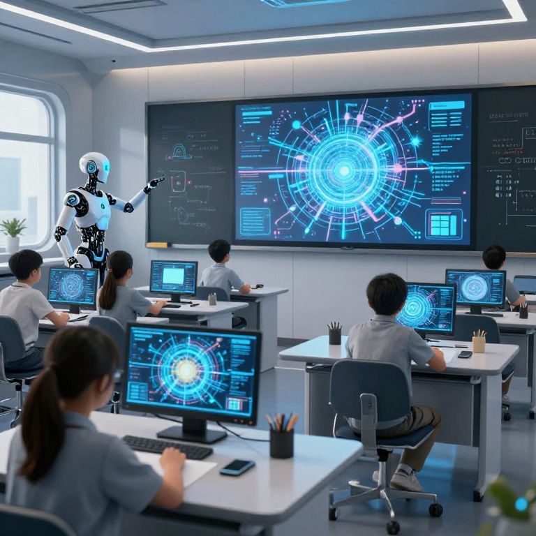 Photograph of a modern, brightly lit classroom with white walls and large windows on the left. Six Asian students, wearing white shirts, sit at desks, each focused on their computer screens displaying a blue, circular, holographic interface. A black and white humanoid robot stands to the left, gesturing towards a large, dark chalkboard with similar holographic designs in blue and white. The ceiling has sleek, rectangular lights. Desks have pencils in holders, and a small potted plant is on the far left. The room exudes a futuristic, tech-savvy atmosphere.