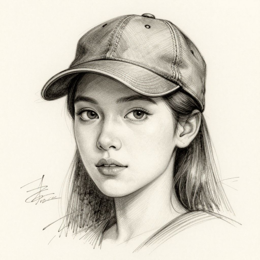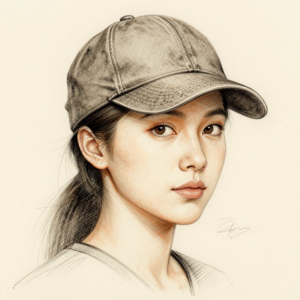 Black-and-white digital pencil drawing of an East Asian woman with long, straight hair, wearing a baseball cap slightly tilted forward. Her expression is neutral, with large, almond-shaped eyes and subtle, natural makeup. She has a smooth complexion and delicate features. The background is completely white, emphasizing the subject. The artist's signature is in the bottom left corner. The overall style is realistic with fine, detailed line work, highlighting the textures of the hat and hair.