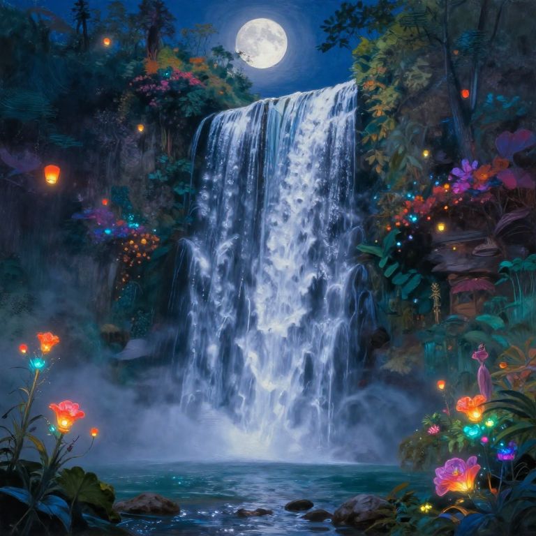 Water fall painting portraying a mystical waterfall glowing under the light of a full moon, surrounded by ethereal floating lanterns and glowing flora, vibrant fantasy colors and magical atmosphere blending reality and imagination in stunning detail.