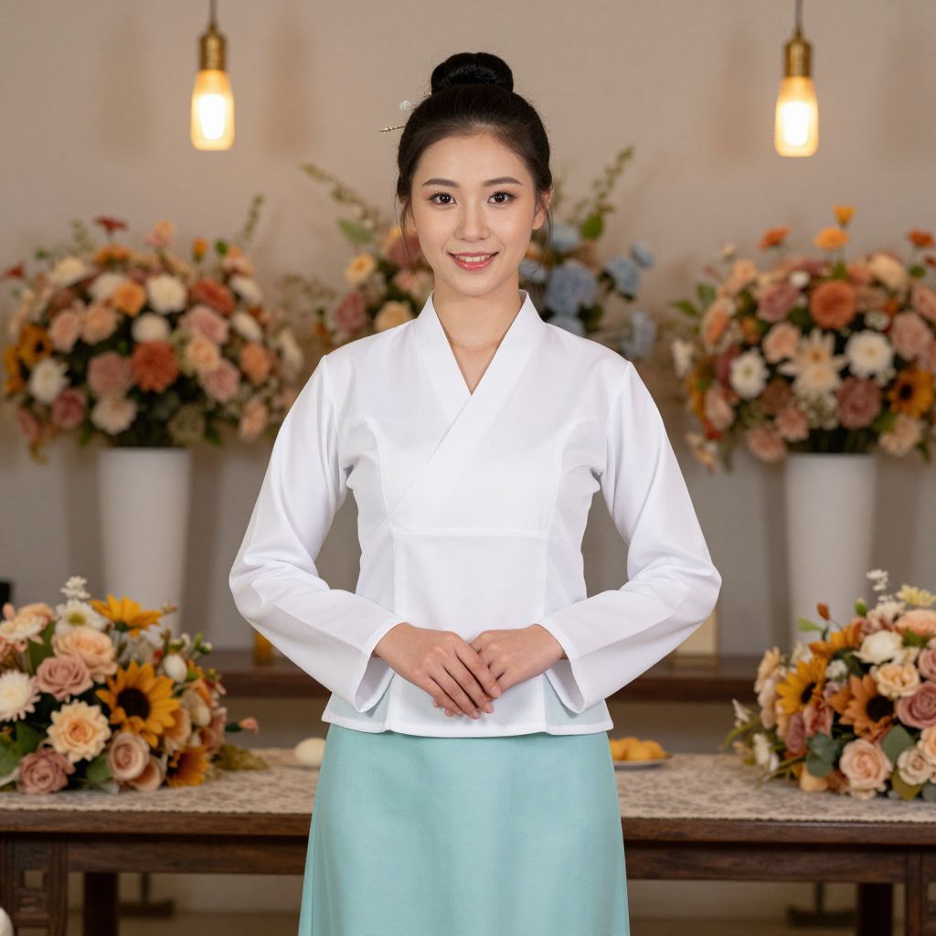 Photograph of an Asian woman standing in a warmly lit room. She has fair skin, black hair styled in a bun, and is smiling with red lipstick. She wears a white, long-sleeved, button-down blouse and a light turquoise skirt. Her hands rest gently in front of her. Behind her, there are two large floral arrangements with a mix of pink, orange, and white flowers in white vases, placed on a wooden table. Two hanging light bulbs with warm glow are visible in the background. The overall setting is elegant and festive.