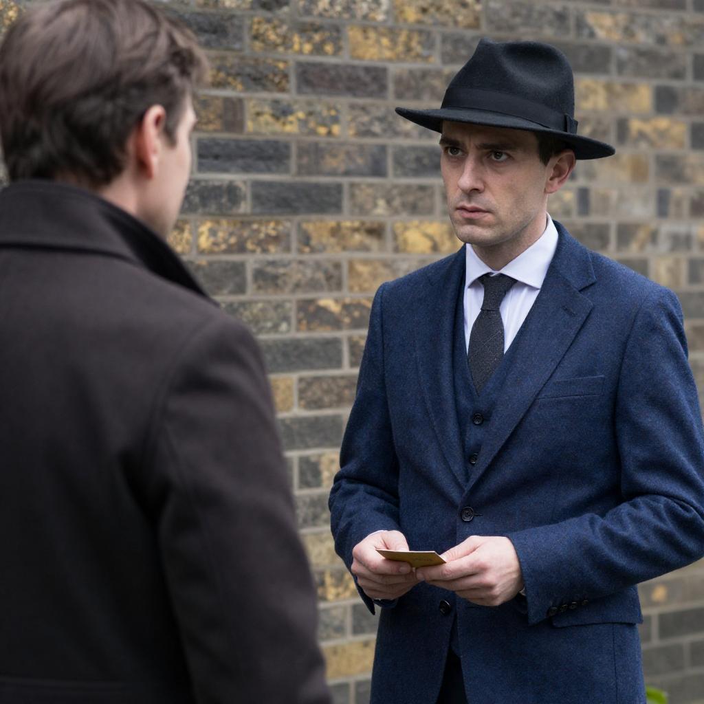 Two men walking out of a dimly lit warehouse with brick walls. One man is wearing a brown coat and hat, carrying a coat in his hand. The other man is dressed in a black coat and hat. Behind them is a green truck with a large red letter 'S' on its back. Blue barrels and industrial items are visible on the left side inside the warehouse.