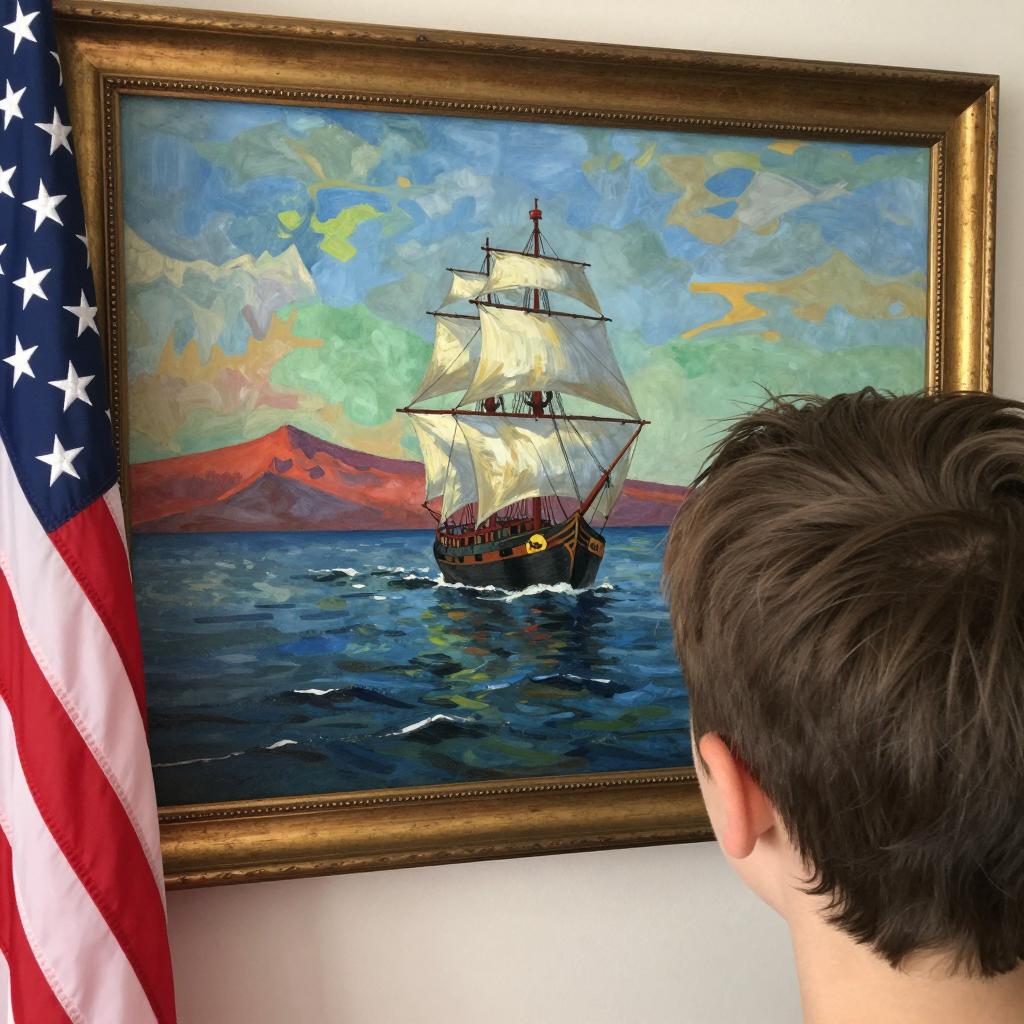 A photograph of a young boy with short brown hair, seen from the back, looking at a framed painting. The painting shows a landscape with a ship in the center, surrounded by blue, green, and red hues. An American flag is on the left. The boy's head is partially in the foreground, right side.