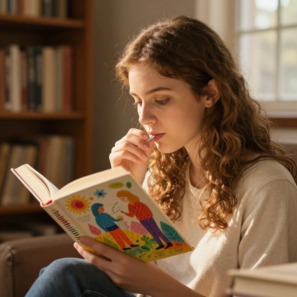 Photograph of a young woman with curly brown hair, reading a colorful children's book, seated in a sunlit library.