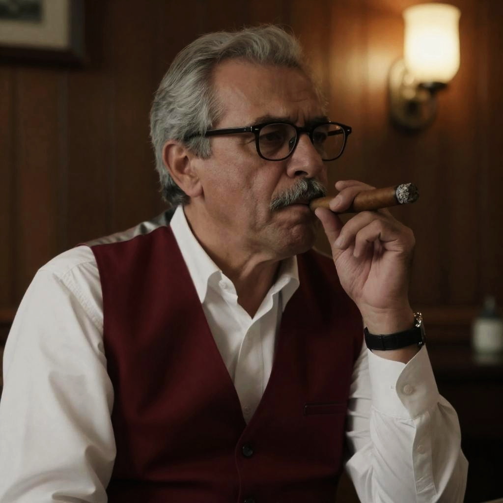 Middle-aged man with gray hair, mustache, and glasses, wearing a white shirt and red vest, holding a cigar to his mouth. Wooden background with a lit wall sconce. Intense, focused expression. Warm indoor lighting. Seated.