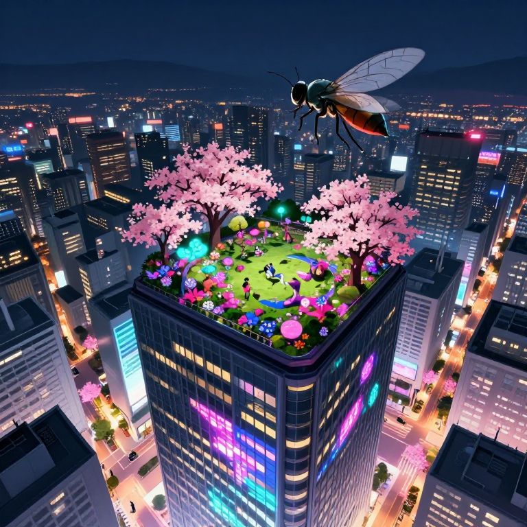 A vibrant digital CGI image depicts a nighttime cityscape with brightly lit skyscrapers. Atop a central building, pink cherry blossom trees bloom around a green lawn filled with colorful flowers and small, black, cartoon-like characters. A large, detailed fly with transparent wings hovers above the rooftop. The city's lights include neon blues, pinks, and yellows, creating a lively contrast to the dark, starless night sky. The perspective is an aerial view, highlighting the surreal, whimsical nature of the scene.
