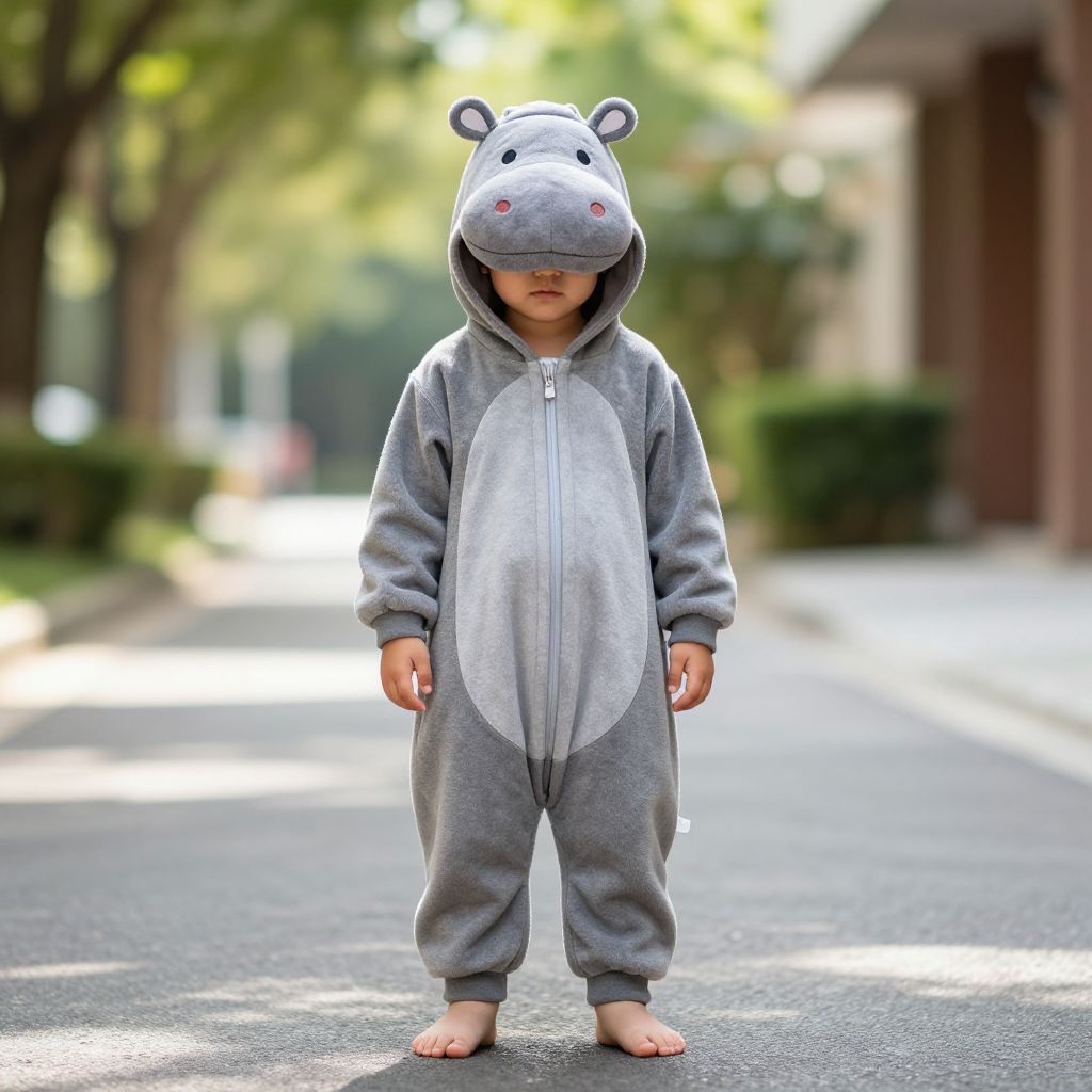 A photograph of a young child standing on a sunlit, tree-lined street wearing a gray, full-body hippo onesie with a hood featuring a hippo face. The child's feet are bare, and they stand with hands by their sides. The background shows blurred greenery and a brown building to the right. The overall scene is bright and playful.
