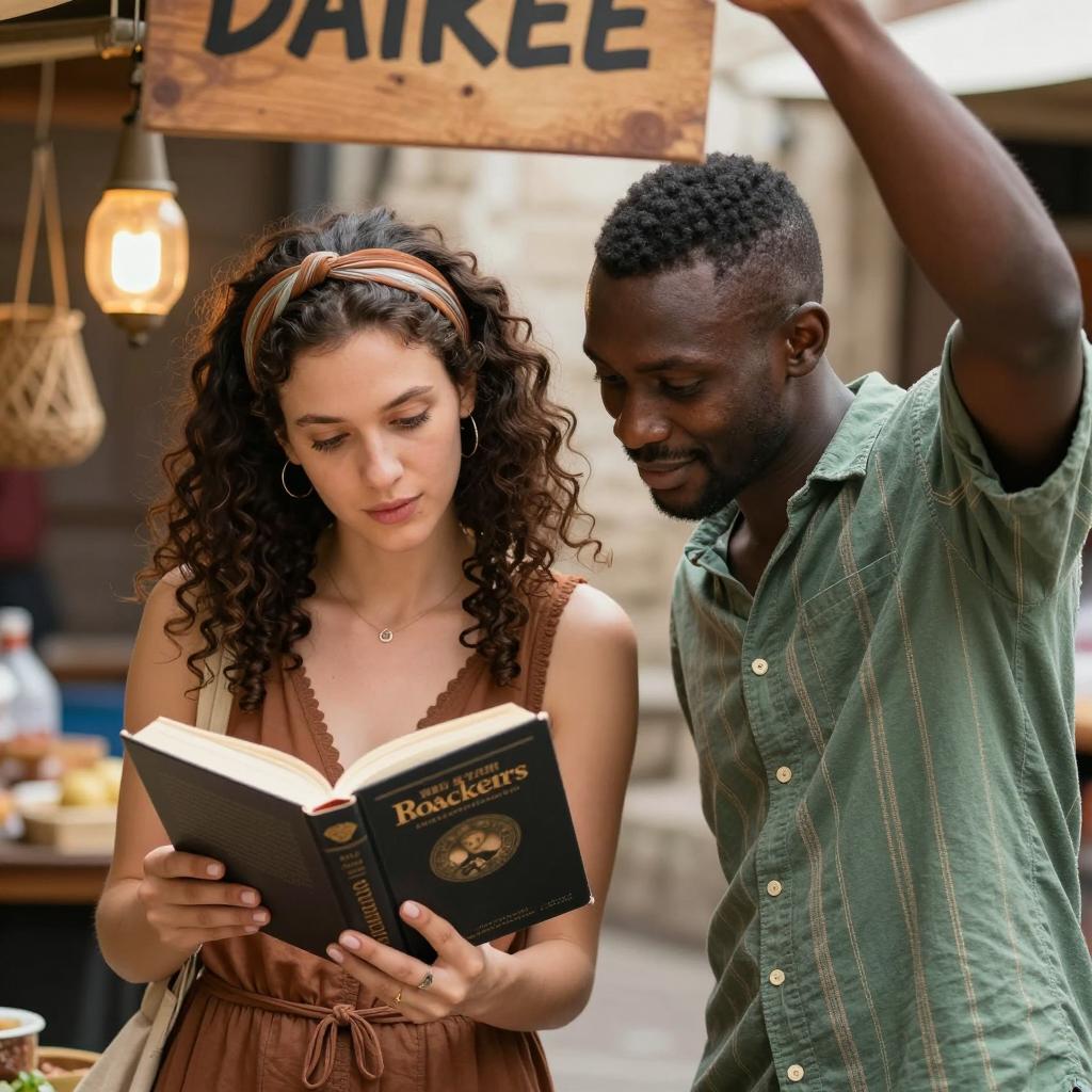 Two people in a market setting. A woman with long curly hair, wearing a headband and brown dress, holds a black book. A man with a short buzz cut, wearing a green striped shirt, leans forward with a smile. A wooden sign and hanging lamp are in the foreground. Both look focused at the book. Background includes a stone wall. The man's arm is raised.