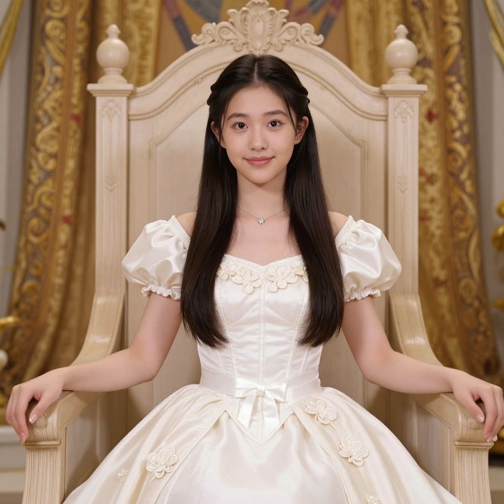 This is a digitally rendered image of an East Asian woman with long, straight black hair, sitting on an ornate, cream-colored throne with gold accents. She wears a white, off-the-shoulder, satin ball gown with puffed sleeves and delicate lace detailing on the bodice. Her skin is fair, and she has a gentle smile. The background features rich, gold-patterned curtains. She wears a simple necklace with a small pendant. The overall style is regal and elegant, with a focus on the subject's poised and royal appearance.