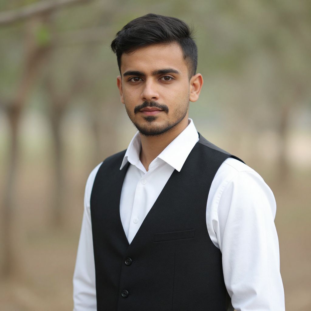 Photograph of a young South Asian man with medium brown skin and black hair, styled short with a side part. He has a neatly trimmed mustache and goatee. He is wearing a white dress shirt with a black vest over it, buttoned up. The background is softly blurred, featuring a forest with green and brown hues, suggesting an outdoor setting. The man has a serious expression, looking directly at the camera. The lighting is natural, highlighting his face and upper body. The overall style is modern and professional.