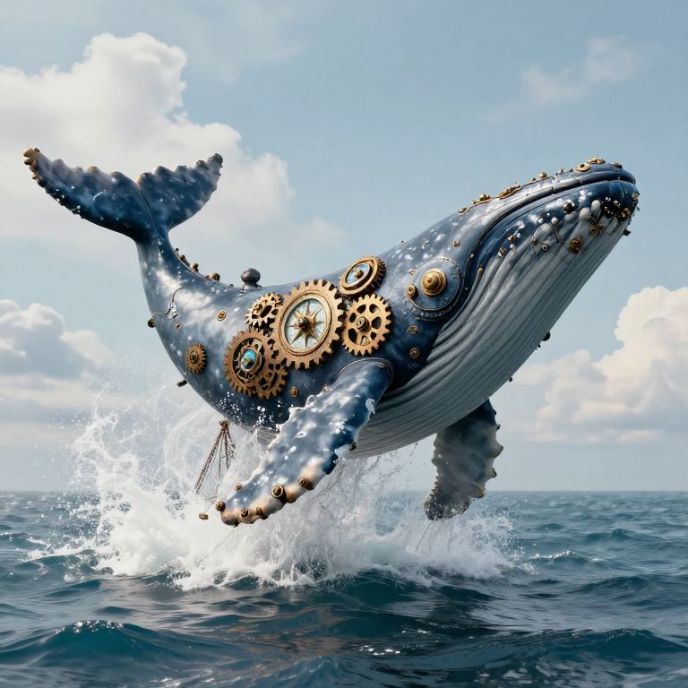 Digital artwork of a mechanical humpback whale with gears and cogs, leaping out of ocean water under a bright blue sky.