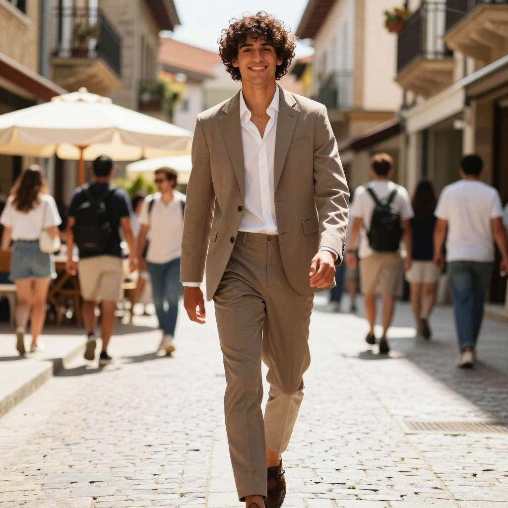 Photograph of a young man with curly black hair, light brown skin, and a slender build walking confidently down a sunlit cobblestone street in a European town. He is wearing a light brown suit with a white dress shirt, unbuttoned at the top. People in casual summer attire, including shorts, t-shirts, and backpacks, walk in the background. The street is lined with stone buildings featuring balconies and awnings. Sunlit umbrellas are visible on the left, adding a warm, inviting atmosphere. The man's smile and relaxed posture convey confidence and ease.