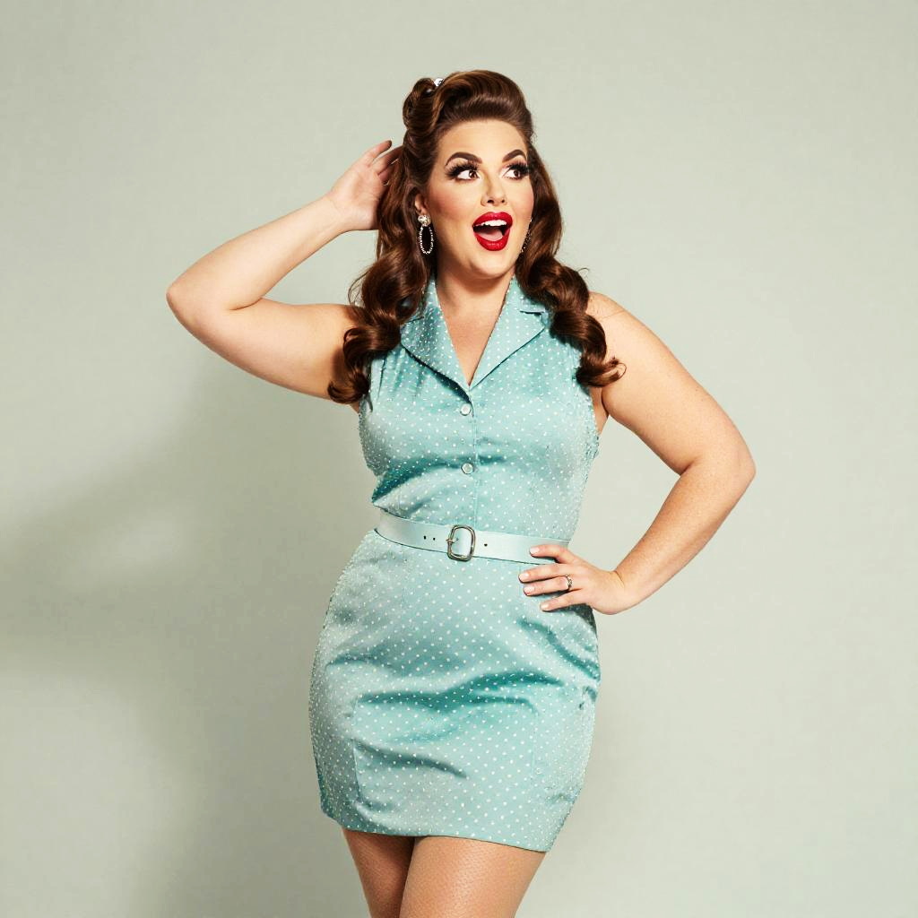 Thicc woman posing in vintage 1950s pinup style, retro outfit and hairstyle, pastel background, classic retro colors, playful expression, high contrast lighting