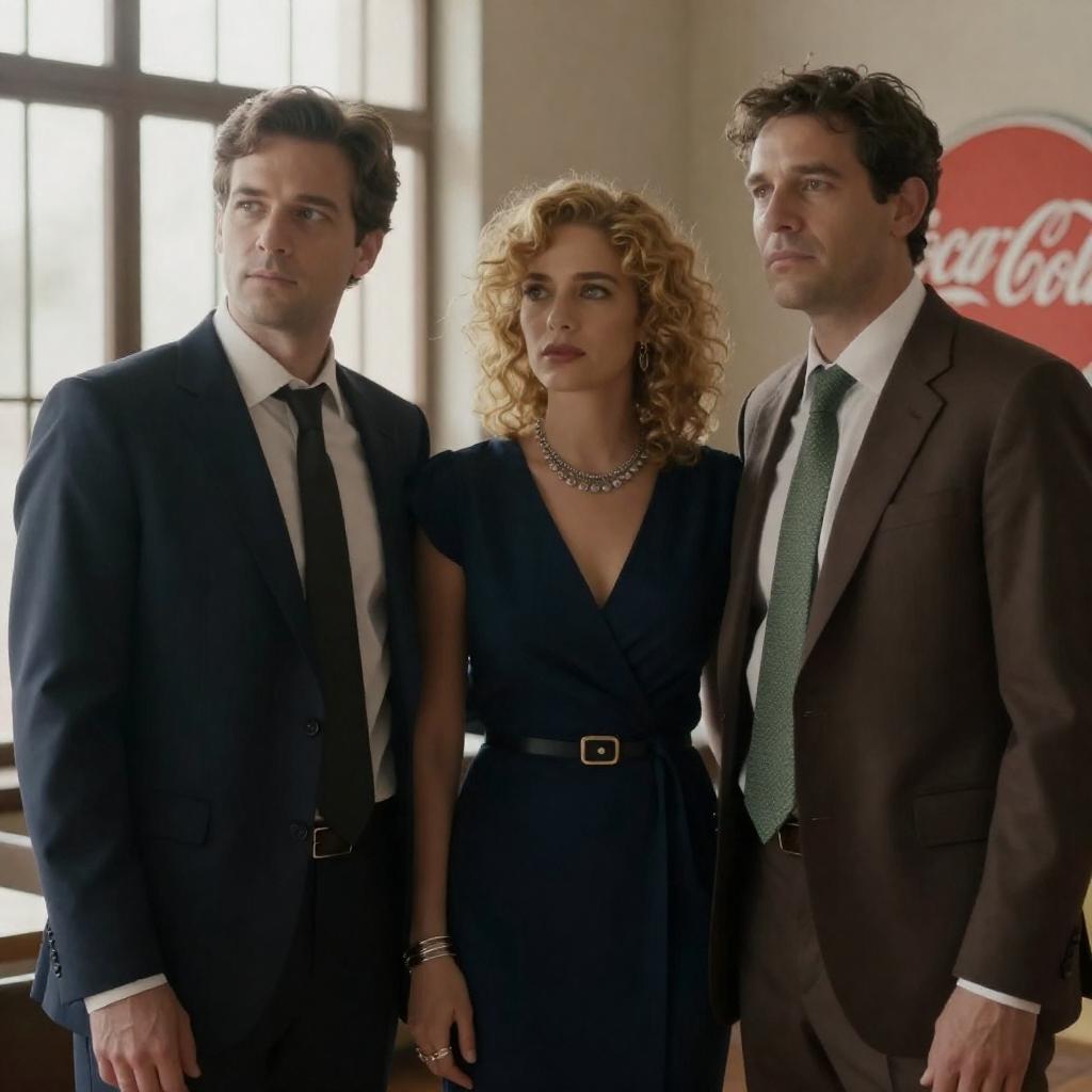 Photograph of three people. Center woman with curly blonde hair, dark blue dress, and silver jewelry, stands between two men. Left man in dark suit with white shirt and black tie, right man in brown suit with white shirt and green tie. Background has a window with bars and a Coca-Cola sign. All three look at each other.