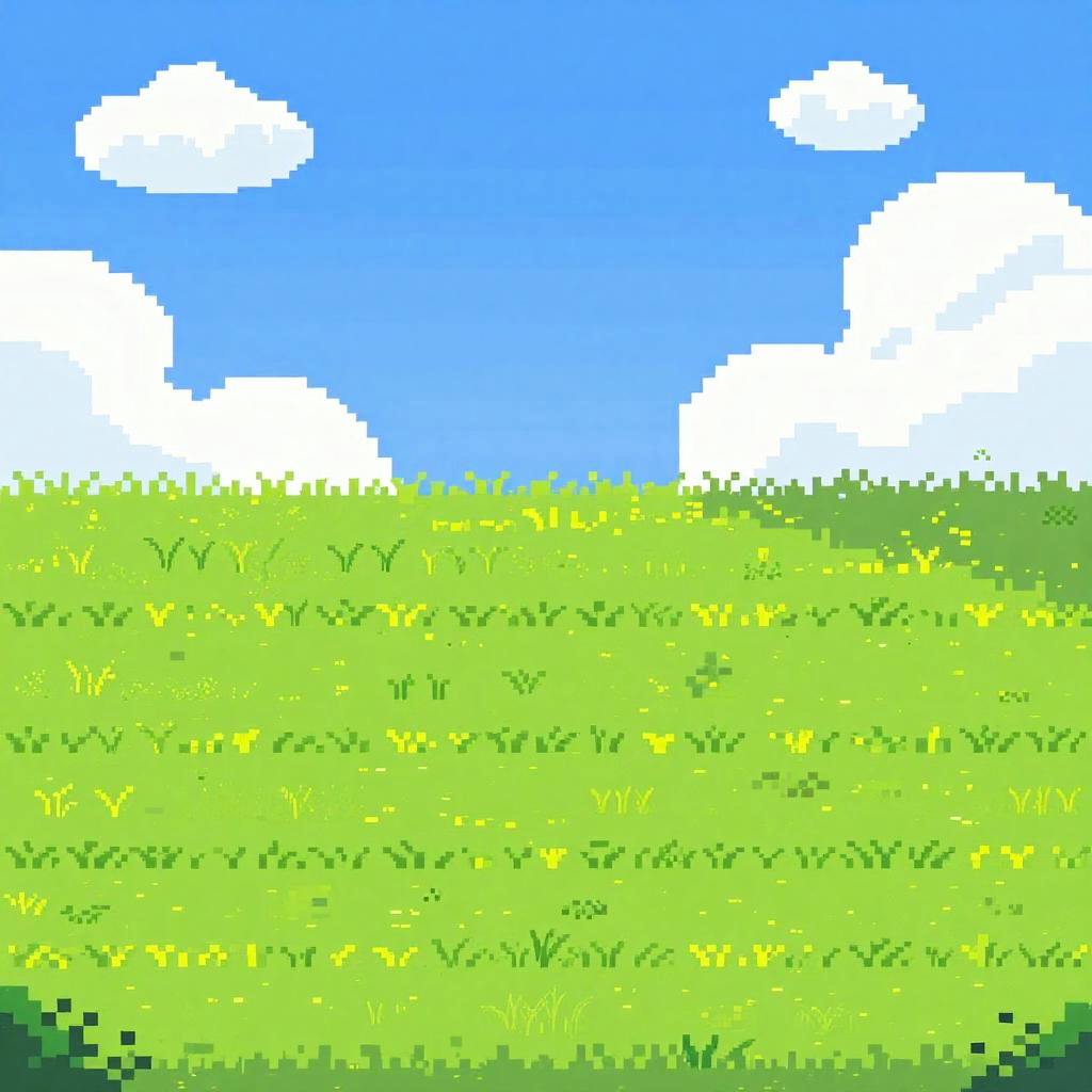 Stardew Valley grass field with dew drops sparkling under morning light, pixelated detailed blades, quaint countryside background, cozy and calm environment, gentle breeze