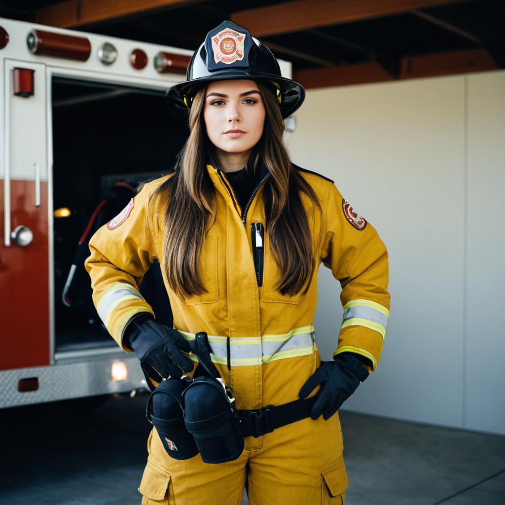 Portrait of a young woman dressed as a firefighter, wearing a red firefighter helmet and matching red jacket with official fire department patches. She has long blonde hair and blue eyes, looking directly at the camera with a neutral expression. A fire truck is blurred in the background, suggesting an outdoor setting possibly near a fire station or emergency scene.
