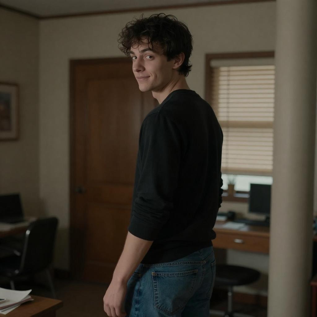 Photograph of a young man with fair skin and dark, slightly messy hair, standing in a dimly lit room. He wears a black long-sleeve shirt and blue jeans, looking over his shoulder with a slight smile. Background includes a wooden door, a window with blinds, and a cluttered desk with various items. A beige column is partially visible on the right.
