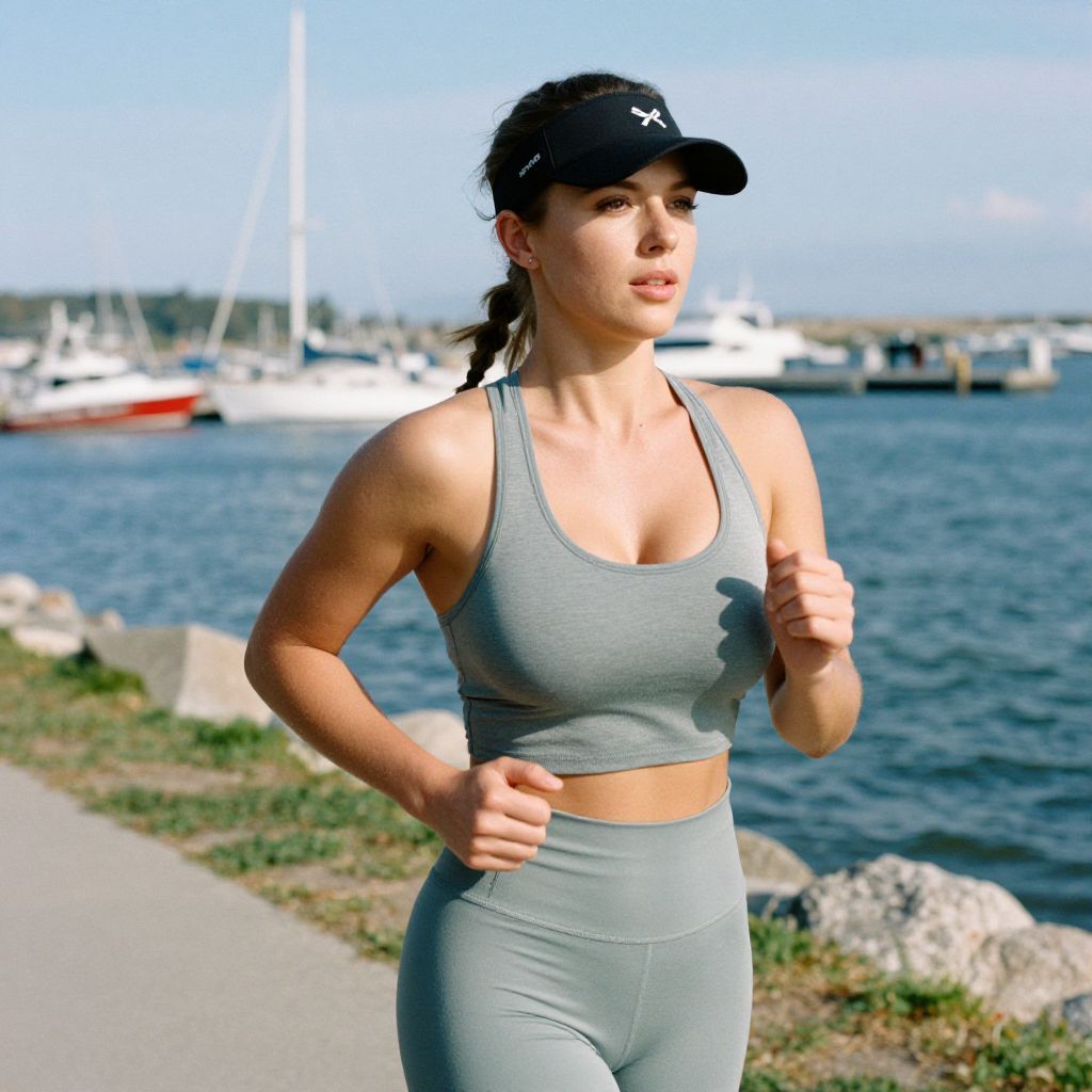 A Stocky woman, kodacolor analog film style, athletic leisure, racerback cropped tank top in heather gray, matching high-waisted leggings, black visor cap with white logo, at a picturesque harbor, jogging along the waterfront. Sexy. Pretty face and beаutiful eyes. Big breasts