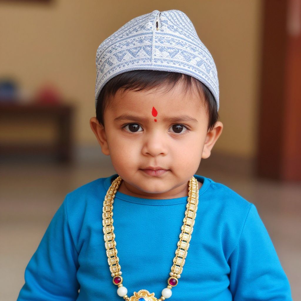 "baby krishna male costume, solo, male focus, 1boy, necklace, jewelry, looking at viewer, hat, facial mark, child, black hair, long sleeves, forehead mark, closed mouth Realistic photo of casual sexy person with pretty face"